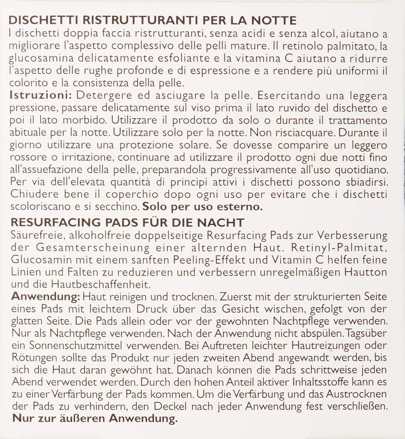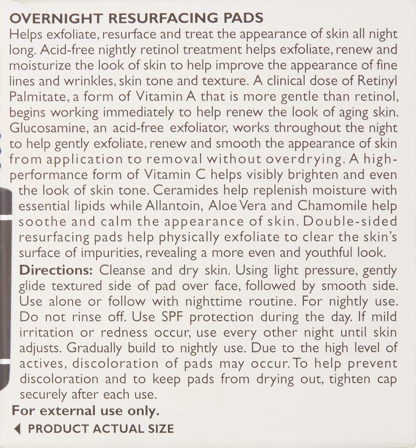 Helps exfoliate, resurface and treat the appearance of skin all night long. Acid-free nightly retinol treatment helps exfoliate, renew and moisturize the look of skin to help improve the appearance of fine lines and wrinkles, skin tone and texture. A clinical dose of Retinyl Palmitate, a form of Vitamin A that is more gentle than retinol, begins working immediately to help renew the look of aging skin. Glucosamine, an acid-free exfoliator, works throughout the night to help gently exfoliate, renew and smooth the appearance of skin from application to removal without overdrying. A high performance form of Vitamin C helps visibly brighten and even the look of skin tone. Ceramides help replenish moisture with essential lipids while Allantoin, Aloe Vera and Chamomile help soothe and calm the appearance of skin. Double-sided resurfacing pads help physically exfoliate to clear the skin’s surface of impurities, revealing a more even and youthful look.
